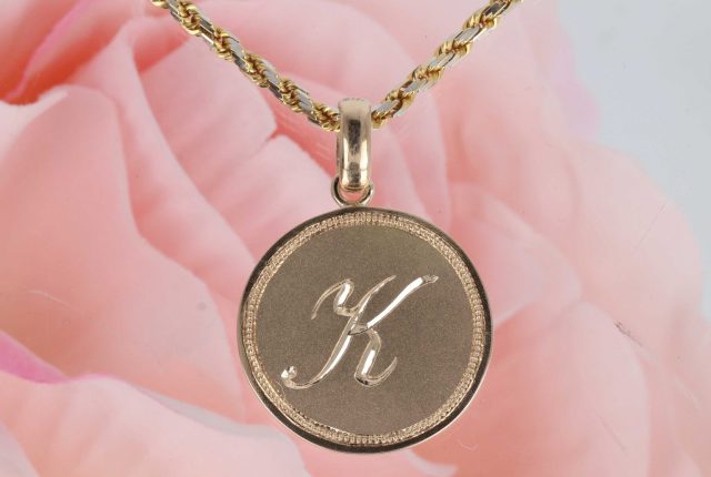 4本の内、しっかりしたキヘイネックレスから、お客様のイニシャルKを彫り込んだヨシダオリジナルイニシャルペンダントを別作する事をご提案しました。
