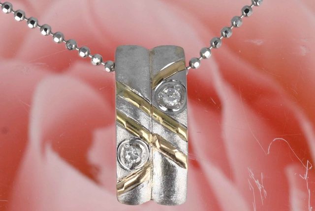 プラチナの上にk⒙のラインとメレのデザインがありましたので、それを活かして二本並べて繋ぎペンダントを作る事になりました。